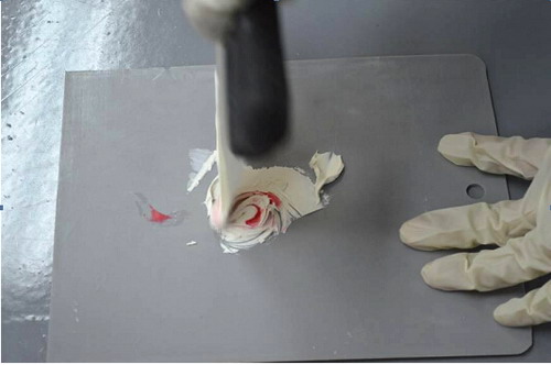 (7)如此重復(fù)地拌和,在這過程中注意觀察混合物顏色的均勻程度,直到原子灰充分拌和。如圖2-39所示。