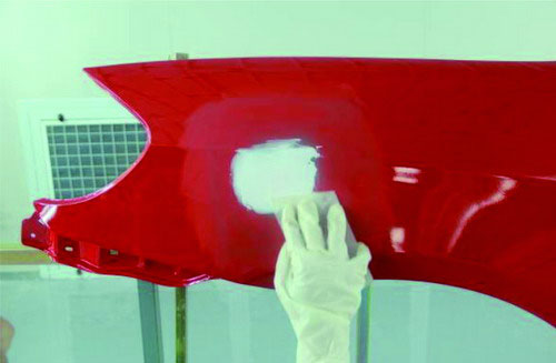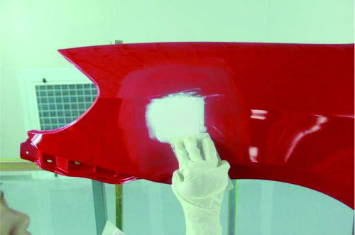 在進行原子灰刮涂之前,應(yīng)先對已經(jīng)刷涂好的底漆部分進行必要的打磨及清潔。先使用菜瓜布對底漆部分進行輕微打磨,可以去掉底漆多余的那部分漆粉。再用吹塵槍進行除塵清潔,避免刮涂后的原子灰與底漆結(jié)合不牢固。如圖2-31所示。