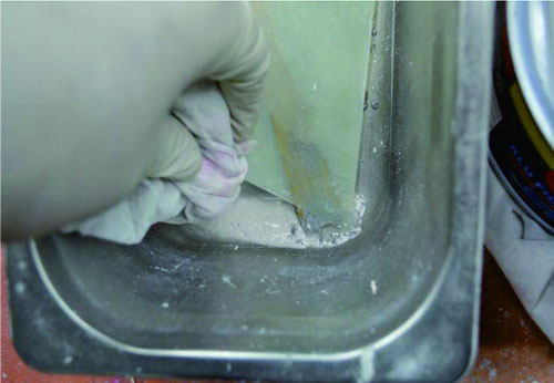 (3)施涂原子灰時要快,必須在混合以后大約3min以內(nèi)施涂完。如果花費時間太長,原子灰就可能在該道施涂完成前固化而影響施涂。