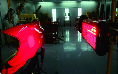 ②紅外線干燥。如果環(huán)境溫度太低或者空氣濕度太大,原子灰干燥固化速度就會減慢。為了縮短原子灰的干燥時間,可以借用干燥器或者是紅外線烤燈加熱原子灰進行干燥。一般烘烤時間設(shè)定為10min左右,在烘烤過程中,要不斷檢測板件的溫度,并檢查原子灰是否已經(jīng)干燥。如圖2-51所示。