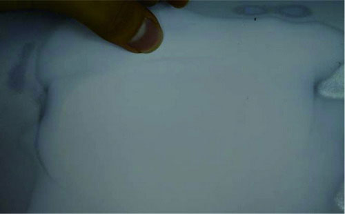 ②指刮法。在原子灰干燥過程中,可以用手指甲輕輕地刮原子灰邊緣薄的部分,檢查原子灰是否已經(jīng)干透。如果沒有干透,則在指甲上會粘有原子灰;如果已經(jīng)干透,則指甲不會粘上原子灰,并在原子灰上出現(xiàn)堅硬的白色痕跡。如圖2-53所示。
