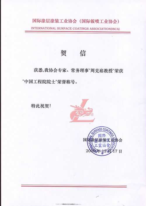 賀國際涂層涂裝工業(yè)協(xié)會專家常務(wù)理事克崧教授榮獲“中國工程院院士”[龍神秘書單位處] 賀國際涂層涂裝工業(yè)協(xié)會專家常務(wù)理事克崧教授榮獲“中國工程院院士”[龍神秘書單位處] 珠海龍神有限公司秘書處賀 2009-12-19 8959