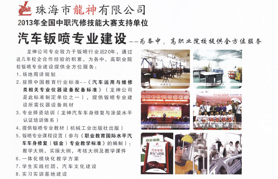 龍神汽車車身修復(fù)與涂裝 水平認(rèn)證培訓(xùn)體系 2013-06-03 25113 龍神公司專業(yè)致力于鈑噴行業(yè)近20年,通過這幾年校企合作經(jīng)驗的積累,為各中、高職業(yè)院校鈑噴專業(yè)建設(shè)提供全方位服務(wù)。
