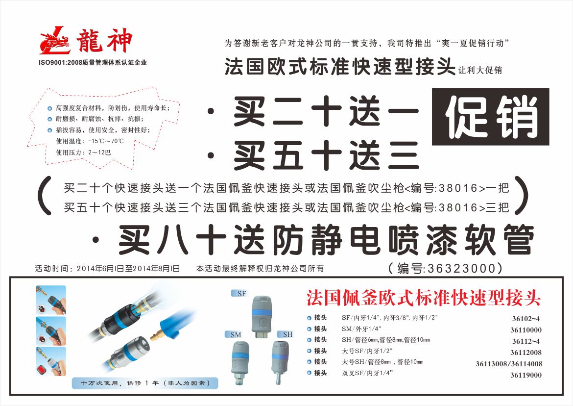 2、買(mǎi)五十送三(即買(mǎi)五十個(gè)快速接頭送三個(gè)法國(guó)佩釜快速接頭或法法國(guó)佩釜吹塵槍(編號(hào):38016)三把)