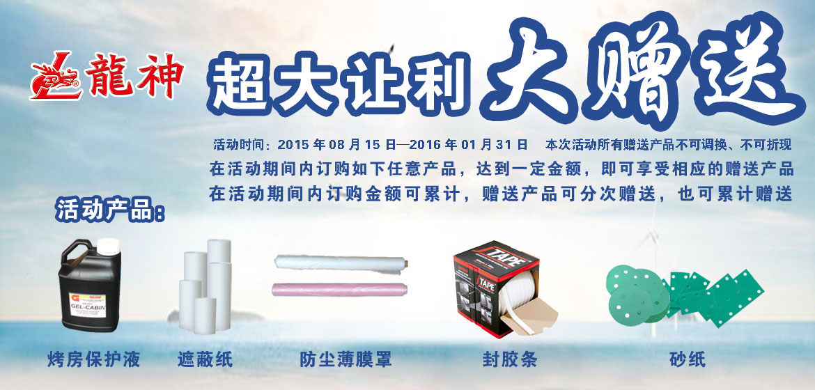 超大讓利﹒大贈(zèng)送 2015-08-17 31583 訂購(gòu)產(chǎn)品:1、烤房保護(hù)液; 2、遮蔽膜; 3、遮蔽紙; 4、泡沫膠條; 5、砂紙。 在活動(dòng)期間內(nèi)訂購(gòu)如上任意產(chǎn)品,達(dá)到下表累計(jì)金額,即可享受相應(yīng)的贈(zèng)送產(chǎn)品。