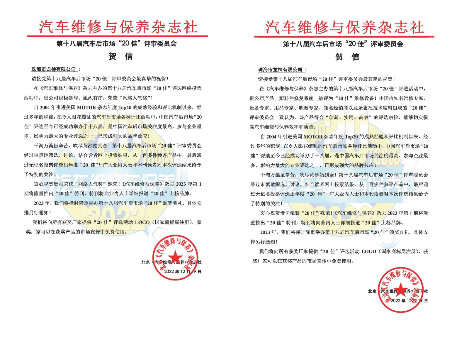 2023年2月16日,由《汽車維修與保養(yǎng)》雜志主辦的第十八屆汽車后市場(chǎng)“20佳”維修工具頒獎(jiǎng)盛典在深圳舉行,在維修設(shè)備與網(wǎng)絡(luò)人氣評(píng)比活動(dòng)中,龍神明星產(chǎn)品“塑料件修復(fù)系統(tǒng)”榮獲2022年度“20佳”維修設(shè)備和龍神公司榮獲2022年度“20佳”網(wǎng)絡(luò)人氣獎(jiǎng)殊榮。