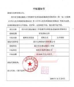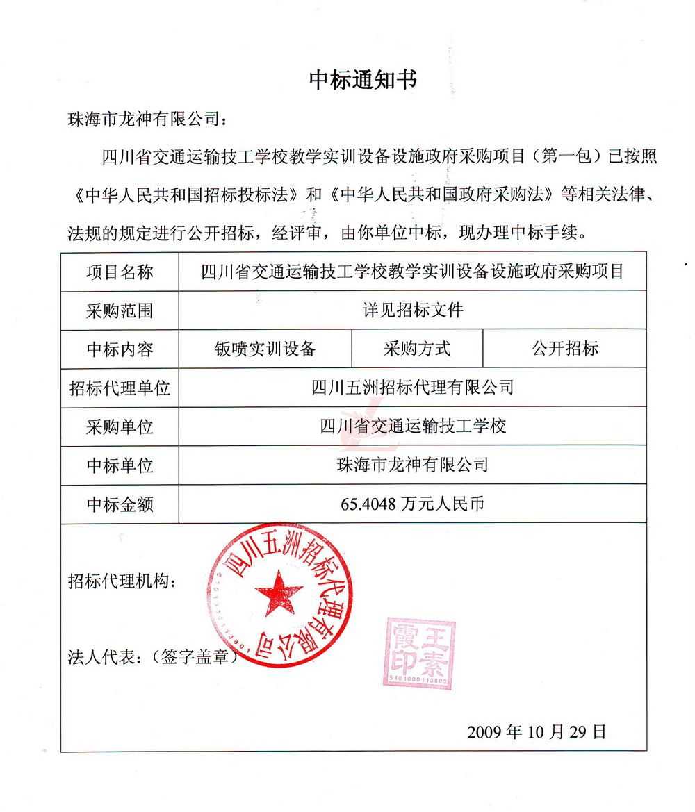 [喜訊]熱烈祝賀龍神成功中標-四川省交通運輸技工學校 [喜訊]熱烈祝賀龍神成功中得四川省交通運輸技工學校標 [新聞中心]珠海市龍神有限公司經(jīng)過長時間的籌備已成功中得四川省交通運輸技工學校教學實訓設(shè)備設(shè)施政府采購項目標,這是珠海市龍神有限公司一種實力的表現(xiàn)。說明了珠海龍神的品牌在不斷的加強、深化。 珠海龍神公司一直專業(yè)、效率、服務、環(huán)保。同時“龍神”在創(chuàng)新中求發(fā)展,在發(fā)展中求創(chuàng)新的原則。 (中標通知書,點擊放大圖) 2009-11-06 9052